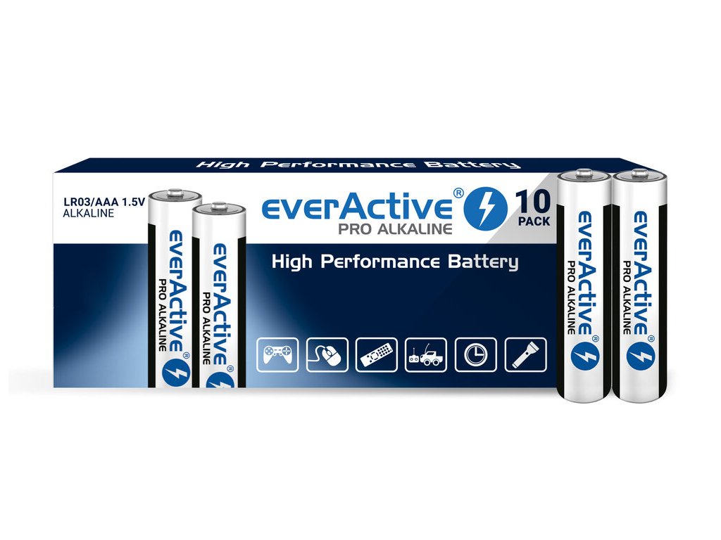 Alkalické batérie AAA everActive Pro LR03 (10 ks) sú ideálnym riešením pre všetky vaše zariadenia, ktoré vyžadujú spoľahlivý zdroj energie. 🔋 Tieto batérie ponúkajú vysoký výkon, dlhú výdrž a sú vhodné pre široké spektrum zariadení, ako sú diaľkové ovládače, hračky, svietidlá či kuchynské váhy.