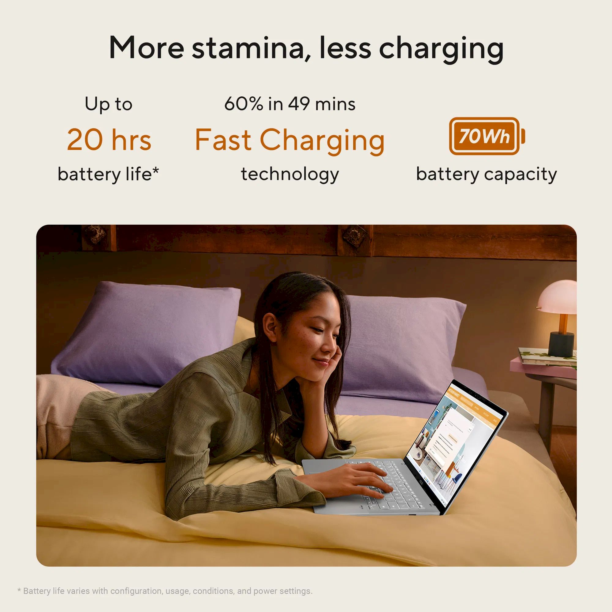 Vďaka batérii s kapacitou 70 Wh vydrží zariadenie pri bežnom používaní celý deň bez nutnosti dobíjania. Pokiaľ predsa len potrebujete doplniť energiu, poteší vás podpora rýchleho nabíjania, ktoré zvládne dobiť batériu na 60 % za menej ako hodinu. To z notebooku robí spoľahlivého parťáka nielen do kancelárie, ale aj na cesty či štúdium mimo domova.ASUS VivoBook S14 je skvelou voľbou pre každého, kto hľadá spoľahlivý, výkonný a elegantný notebook s dlhou výdržou a modernými technológiami. Ponúka profesionálne funkcie v kompaktnom tele, ktoré sa hodia ako do batohu, tak na stôl.
