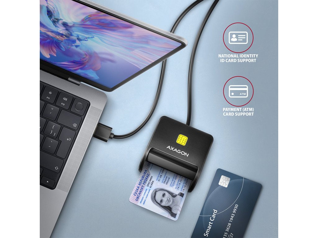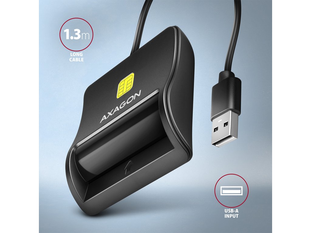 Hliníková 3in1 čítačka pamäťových kariet AXAGON CRE-S3 SUPERSPEED s USB 3.2 Gen 1 rozhraním Kompaktná stolná čítačka Smart card/ID card AXAGON CRE-SM3N FlatReader s USB 2.0 rozhraním. Card reader podporuje všetky bežné formáty kontaktných Smart kariet, čipových kariet a ďalších kariet vrátane kontaktných bankových platobných kariet alebo kontaktných elektronických občianskych preukazov*. Čítačka je plne kompatibilná s aplikáciou eObčanka.Kompatibilita so všetkými bežnými OS ako Windows, Linux, Mac OS a Android umožňuje široké využitie ako na stolných počítačoch a notebookoch, tak aj na telefónoch a tabletoch.