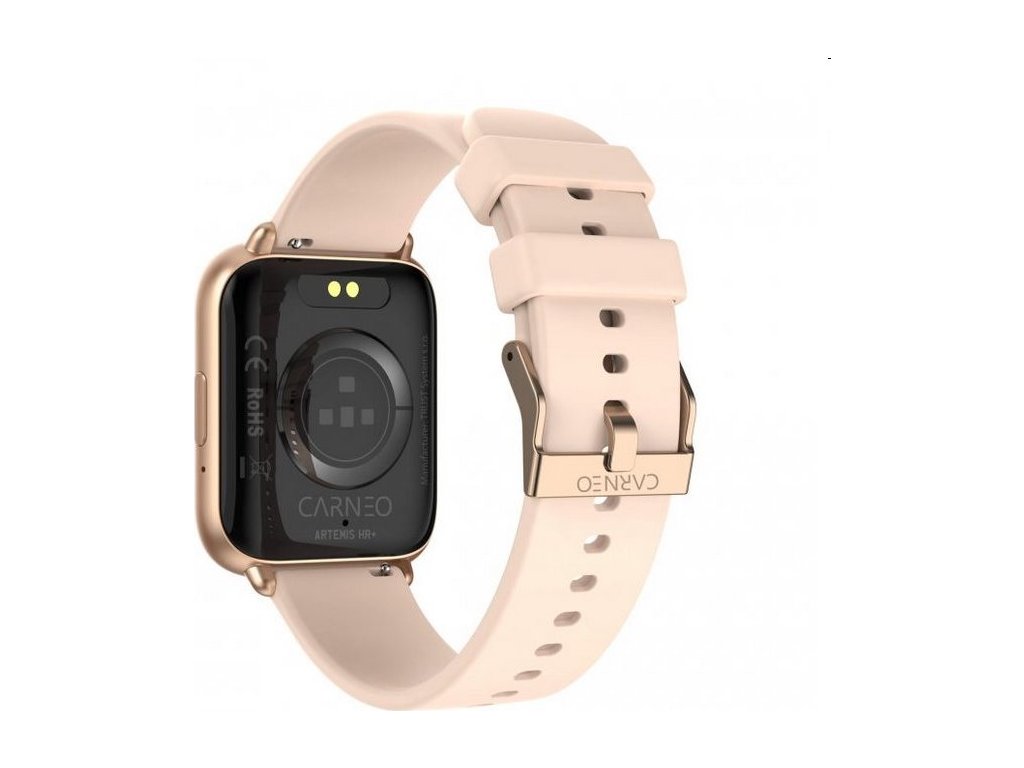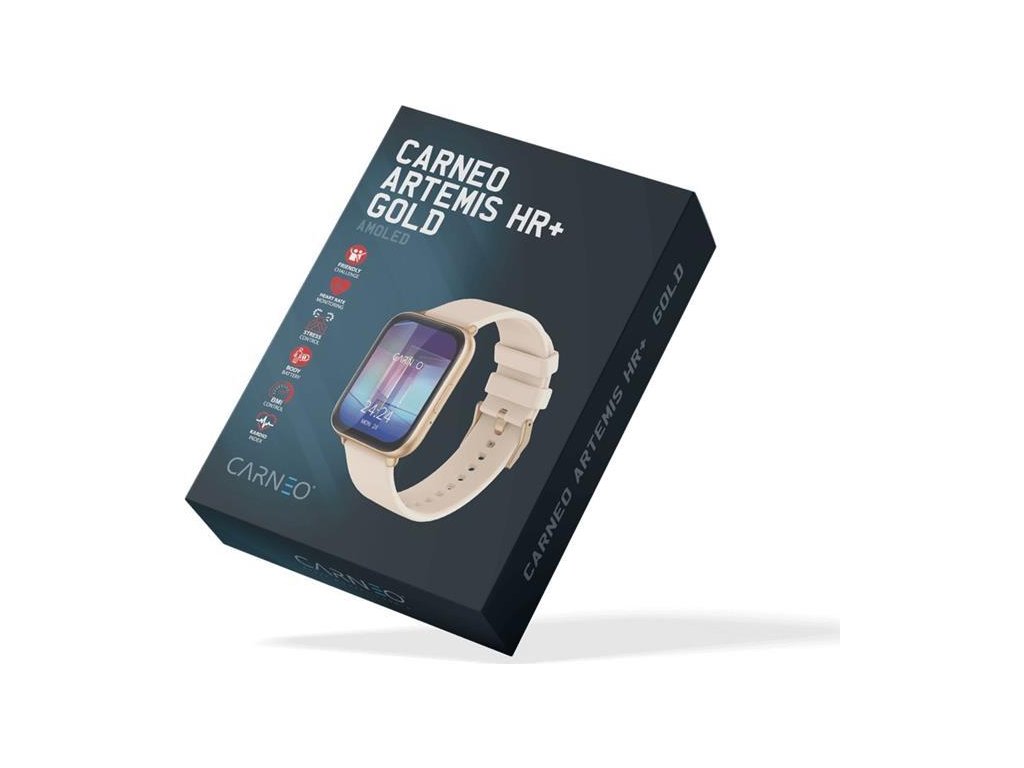Moderné fitness hodinky Carneo Artemis HR+ v elegantnom striebornom prevedení disponujú AMOLED displejom, ktorý je možné aktivovať jednoduchým otočením ruky. Umožňujú meranie krvného tlaku, okysličenie krvi, srdcového tepu, prejdenej vzdialenosti, monitorovanie spálených kalórií či kvality spánku. Ich súčasťou je 250 mAh batéria s výdržou cca 2-3 dní. Podľa certifikácie IP67 sú odolné voči vode a prachu. Hodinky s podporou technológie Bluetooth sú kompatibilné s operačným systémom iOS a Android. Silikónový náramok je príjemný na dotyk a zaručuje komfort po celý deň.