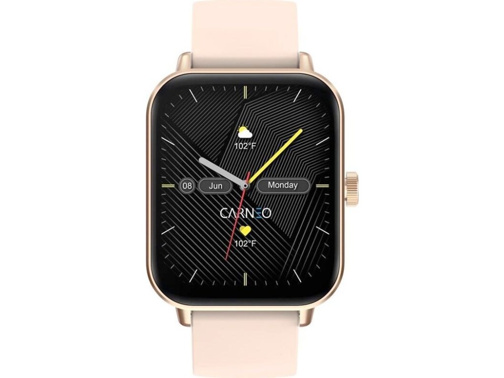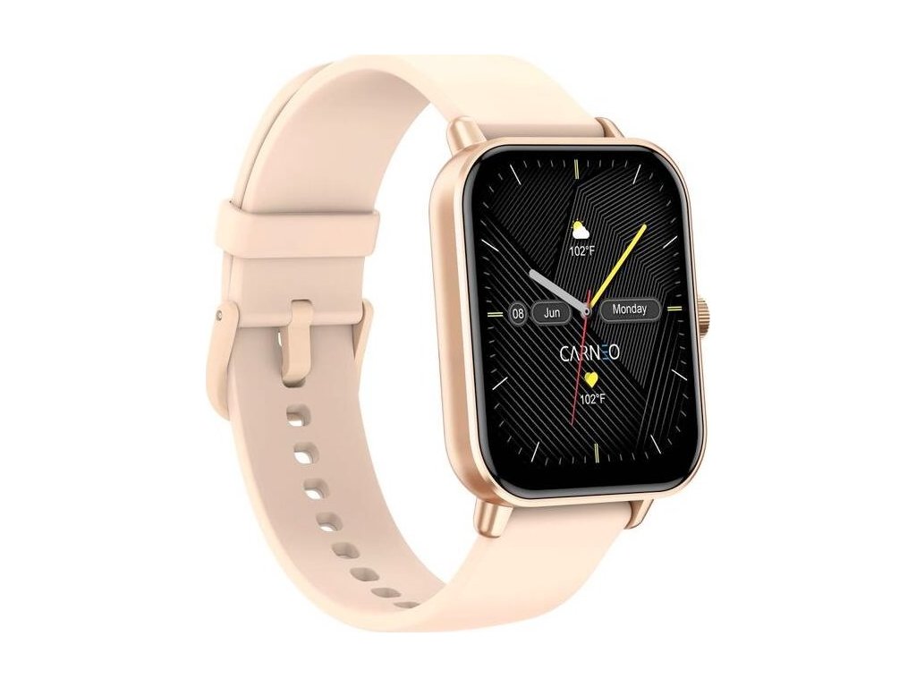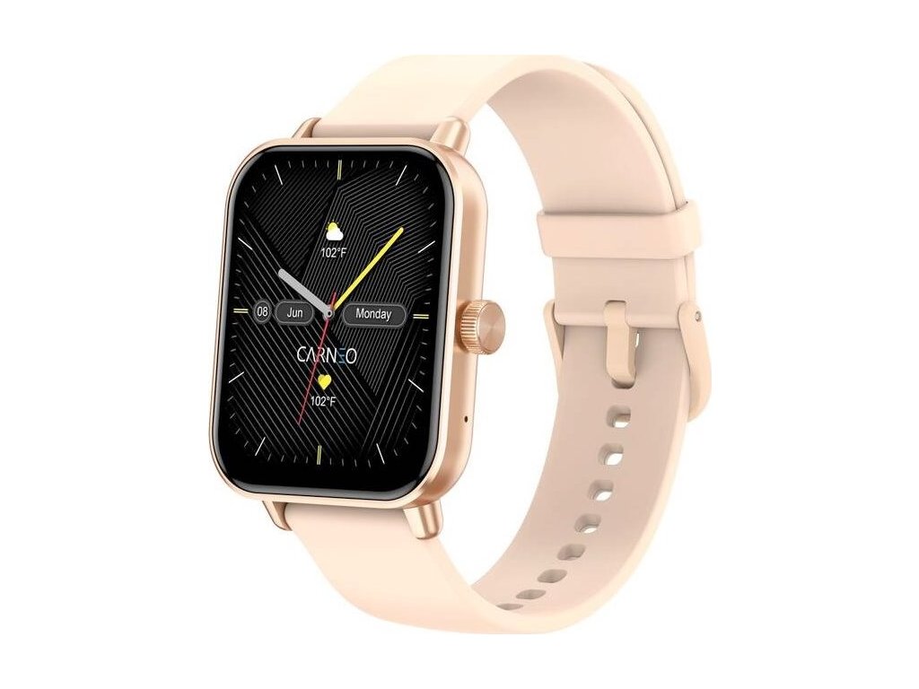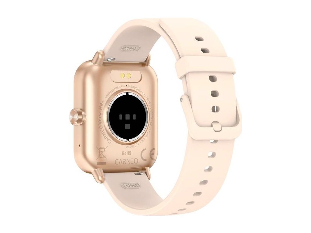Moderné fitness hodinky Carneo Versa HR+ v elegantnom ružovozlatom prevedení sú vybavené farebným displejom IPS, ktorý je možné aktivovať jednoduchým otočením ruky. Meria telesnú teplotu, krvný tlak, okysličenie krvi, srdcový tep, ušlú vzdialenosť, monitorujú spálené kalórie a kvalitu spánku. Ich súčasťou je batéria s výdržou cca 3-5 dní. Podľa certifikácie IP67 sú odolné voči vode a prachu. Hodinky s podporou technológie Bluetooth sú kompatibilné s operačným systémom iOS a Android. Silikónový náramok s kovovou prackou je príjemný na dotyk a zaručuje komfort počas celého dňa.