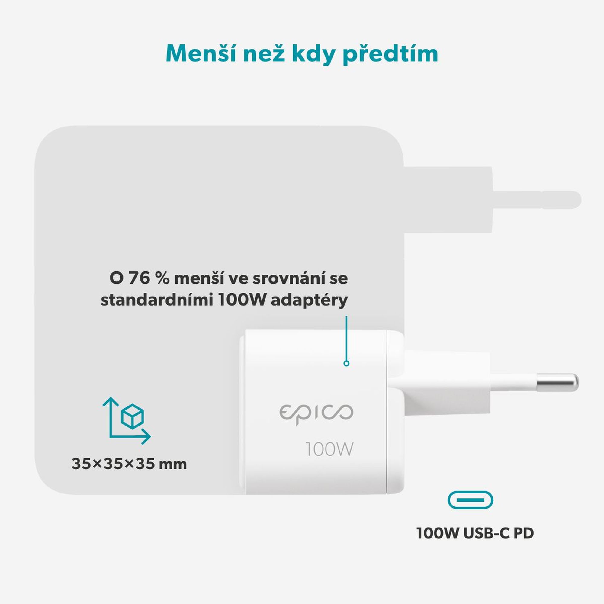 - Až o 76 % menšie rozmery oproti bežným 100W adaptérom