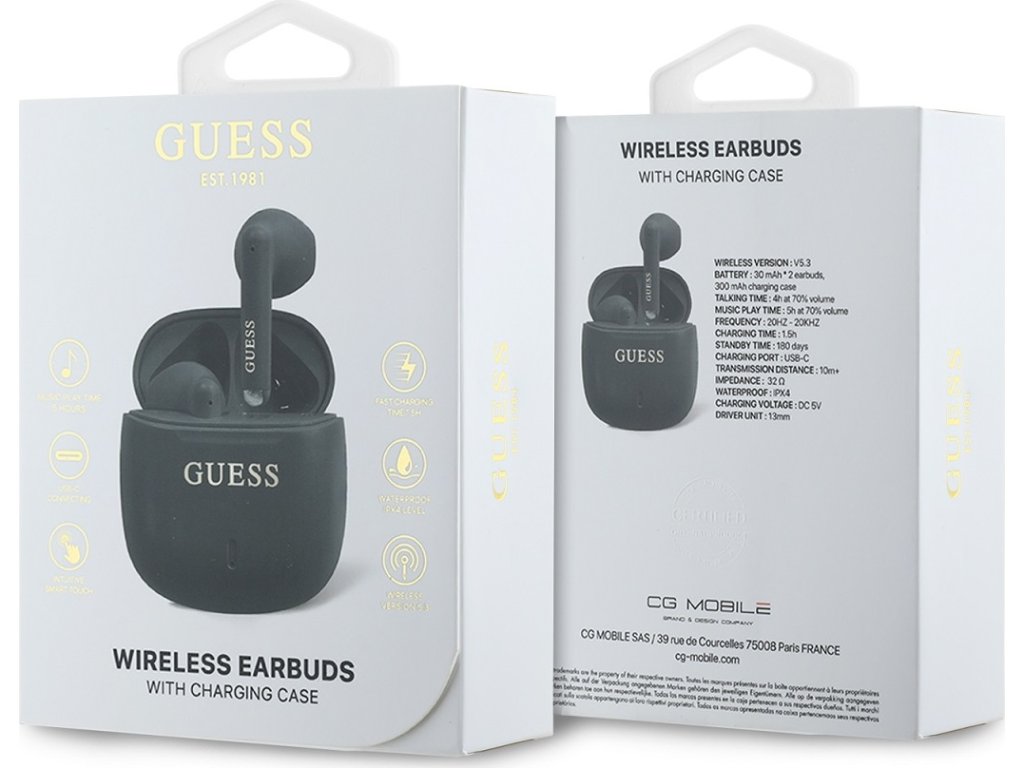 • Štýlové nabíjacie puzdro: Elegantné nabíjacie puzdro s logom Guess nielen chráni slúchadlá, ale tiež ich udržuje plne nabité. Puzdro je kompaktné a ľahko sa zmestí do vrecka alebo tašky.