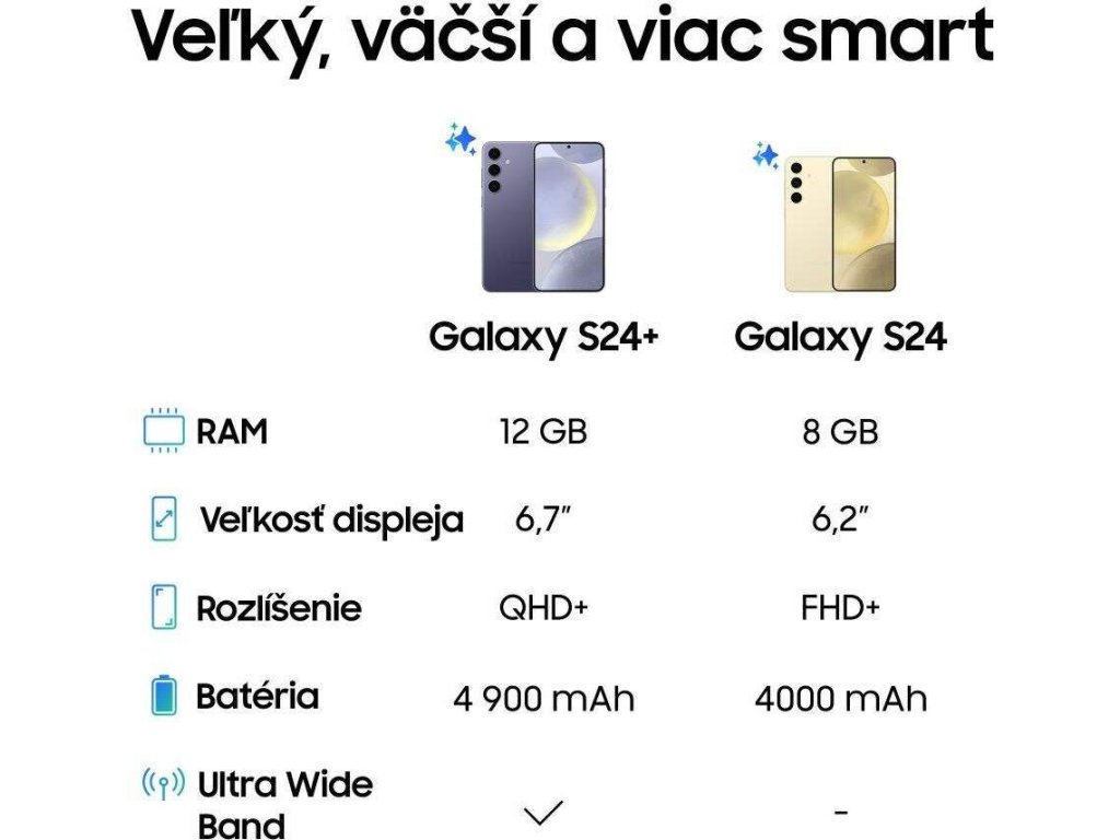 Séria smartónov Galaxy S24 je navrhnutá tak, aby sa stala vašou neoddeliteľnou súčasťou, s celým radom vylepšení. Či už ide o väčšie displeje, vyšší výkon alebo optimalizovanú výdrž batérie, pomôžu vám prekonať radosti a starosti každodenného života. A ak si vyberiete Galaxy S24+, budete si môcť vychutnať pohľad na obrazovku s doposiaľ najvyšším rozlíšením QHD+ na zariadeniach Galaxy.