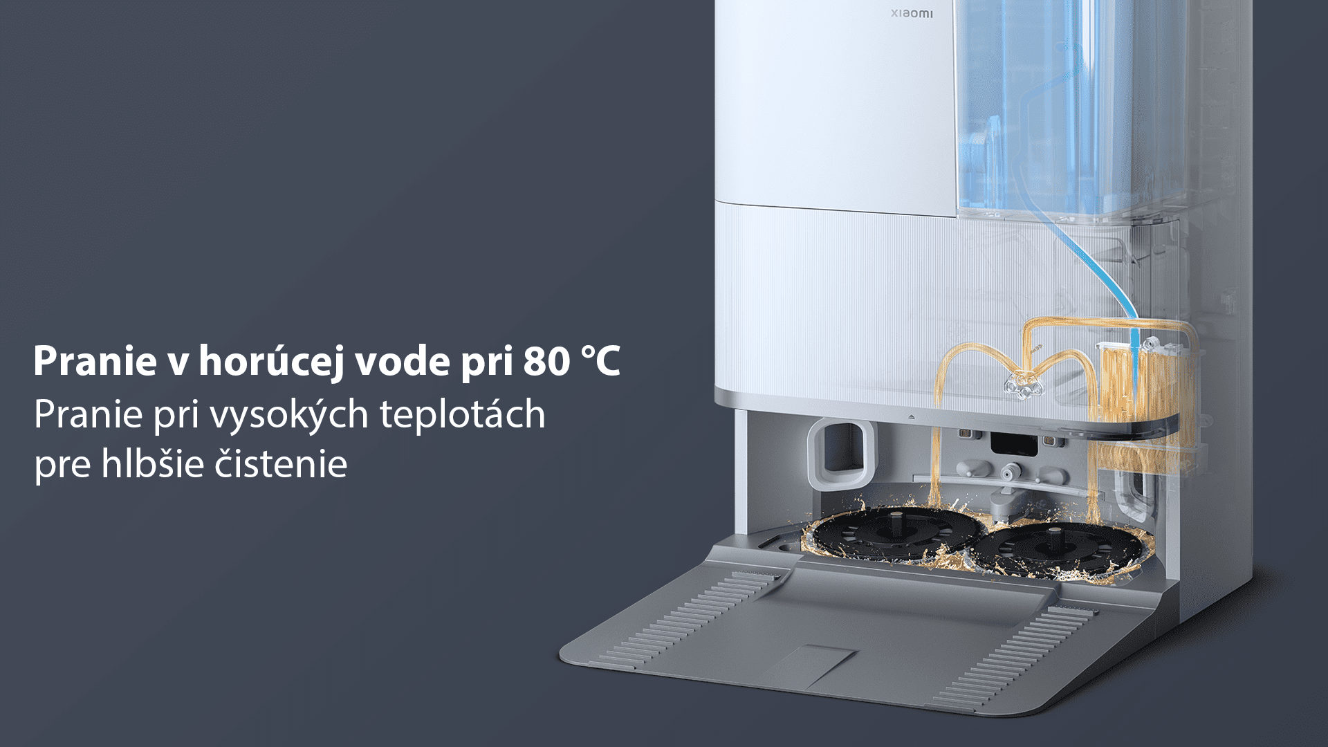 Vylepšená samočistiaca základňa teraz ponúka horúce pranie mopovacích podložiek pri teplote až do 80°C. V kombinácii s vysokorýchlostným odstredivým čistením mopov, odstraňuje nečistoty rýchlejšie a efektívnejšie. Po čistení mopy vyschnú už za 2 hodiny vďaka sušeniu horúcim vzduchom, čím sa znižuje potreba ručného prania alebo sušenia na slnku, ako aj riziko vzniku plesní a nepríjemného zápachu. Veľká 4-litrová nádoba na čistú vodu navyše znižuje potrebu častého dopĺňania, vďaka čomu je ideálna aj na čistenie veľkých domácností. * Teplota vody pri čistení môže dosiahnuť viac ako 80 °C. Údaje testované internými laboratóriami spoločnosti Xiaomi. Skutočné výsledky sa môžu líšiť v závislosti od podmienok prostredia.