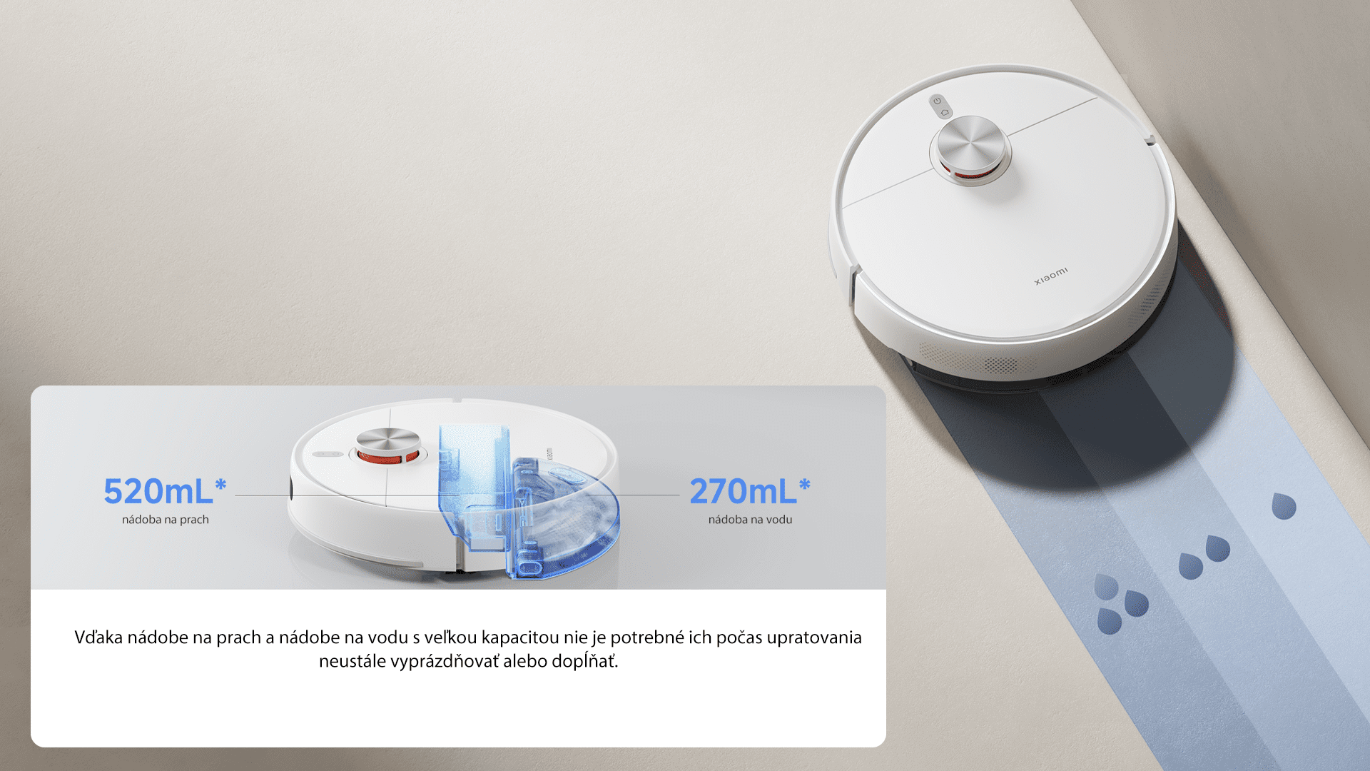Vychutnajte si efektívne čistenie vďaka kombinácii vysávania a mopovania. Vďaka inteligentnému dávkovaniu vody s 3 úrovňami dávkovania, ktoré si môžete nastaviť v aplikácii Xiaomi Home, bude mopovacaia podložka rovnomerne navlhčená a vaše podlahy čisté bez premočených alebo vynechaných miest. Vďaka veľkokapacitnej nádobe na prach a nádržke na vodu, navyše nie je potrebné počas čistenia neustále dopĺňať alebo vyprázdňovať nádoby.